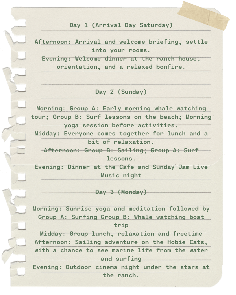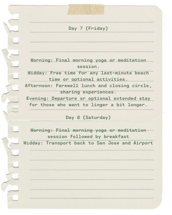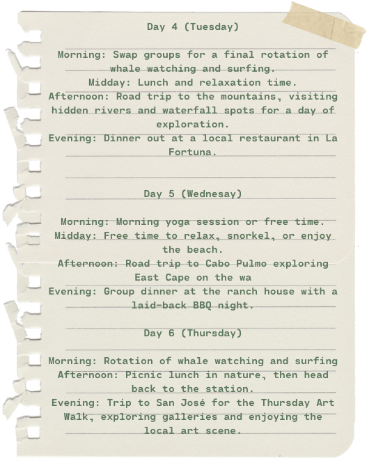 Everything is all-inclusive: accommodation, activities, boat trips, yoga, meditation, underwater music meditation, surf lessons, sailing, whale watching, community BBQs, Sunday Jam, and more. The only things not covered are flights to Cabo and airport transfers (which we can easily arrange).