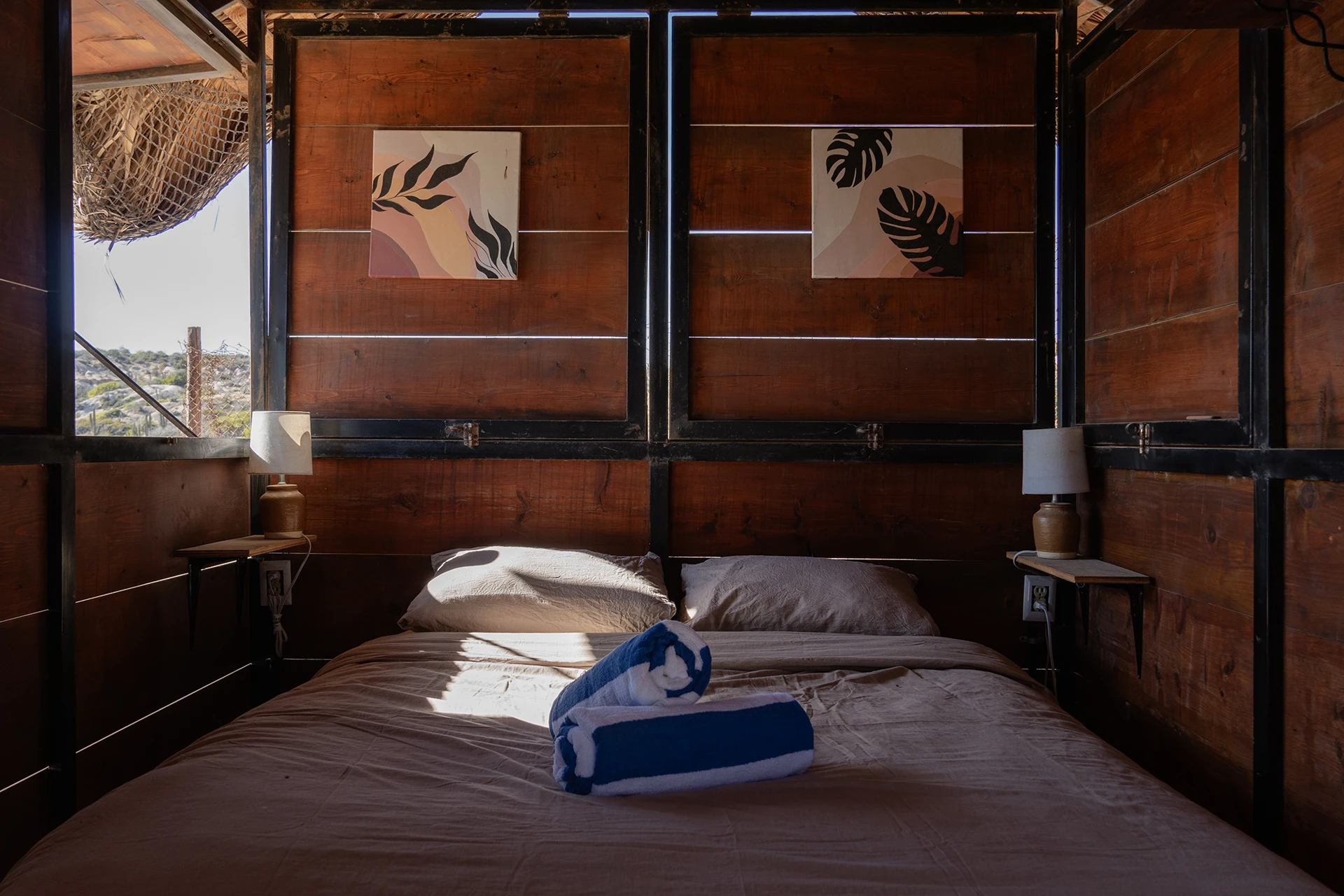 The Palapa Beach Hut has a double size bed made from upcycled pallets and small space for hanging clothes, in addition to a desk. There is front window from which you can see the take off point on La Fortuna’s main surf break, allowing you to actually check the surf conditions from the comfort of your own bedroom.