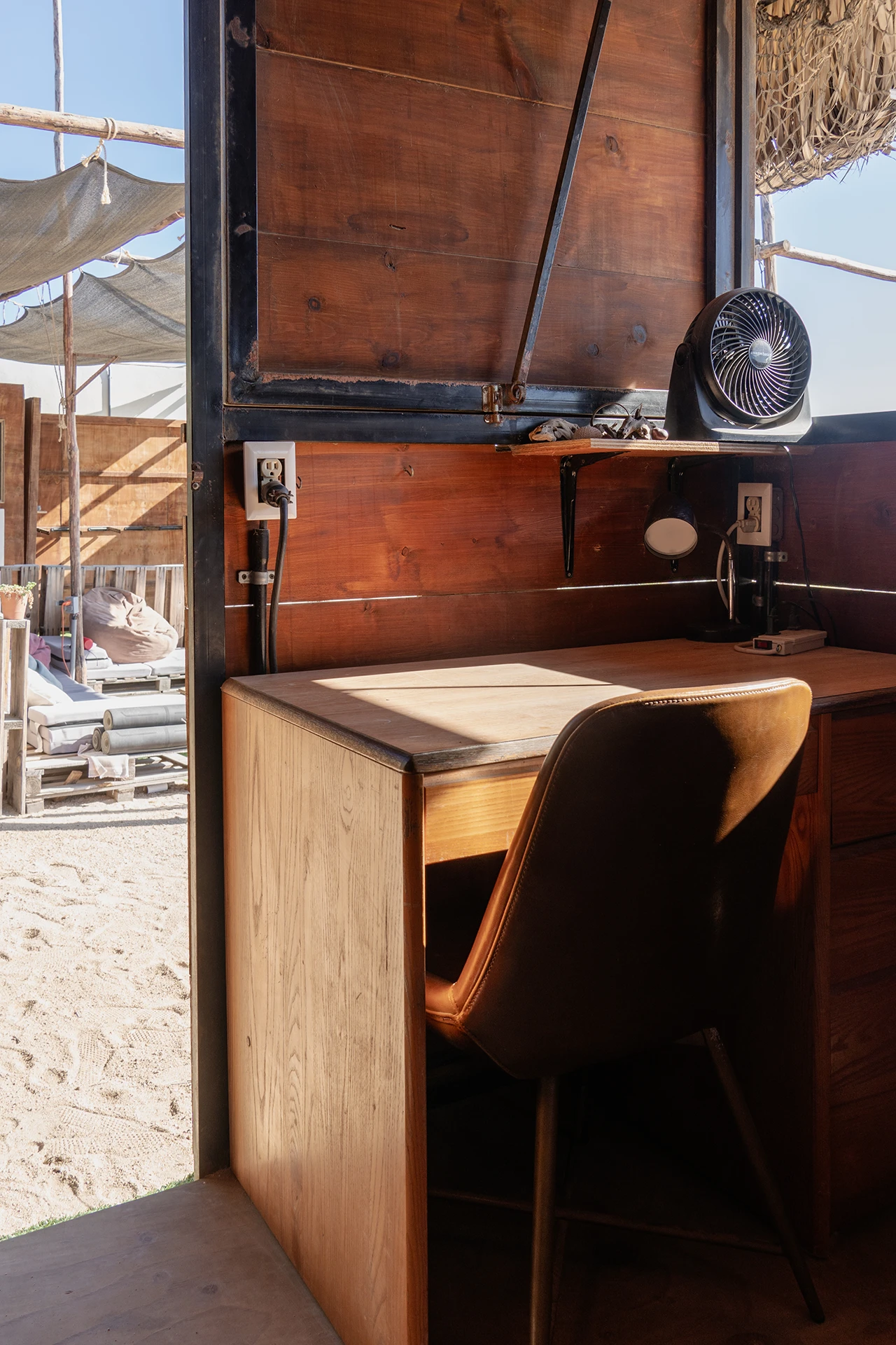 The palm roof and big shutter windows maximise airflow to keep the room cool day and night. Lie in bed and gaze at the stars and in the morning simply sit up to check the surf. Your own desk and chair means you can work remotely, using our starlink wifi and if the surf looks good you can walk down to the water in less than a minute before coming back to your office as you left it.
